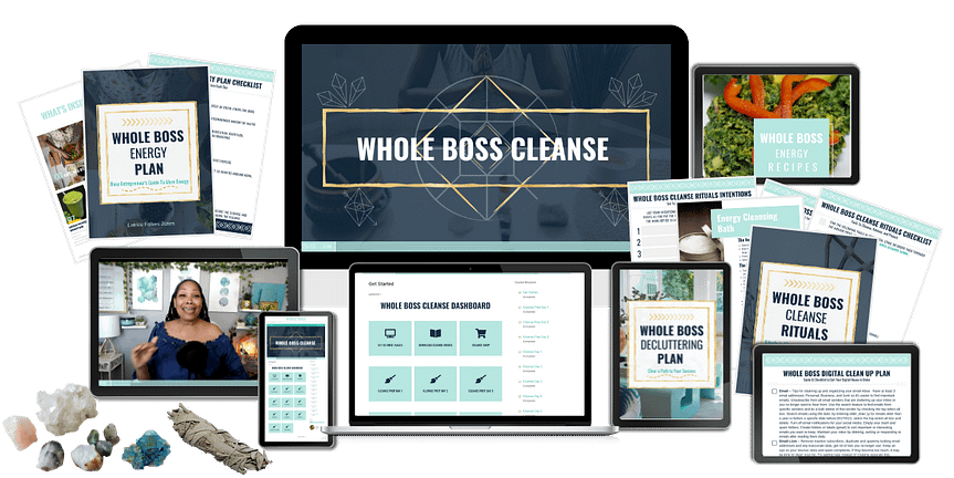 The Whole Boss Cleanse is a 7-day business detox that goes wayyyy deeper than surface-level cleansing. We will not just be clearing our desks and emails, we will also be clearing our energy, blocks, beliefs, fears, and anything else holding us back from success in our life and business.